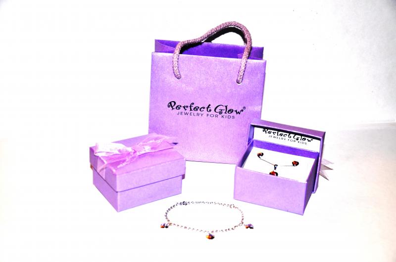 Perfect Glow: This children's line is a complete offering of pendants, earrings, charms, bracelets, necklaces and rings. All jewery designs are produced in sterling silver with Rhodium plating, sold seperately or in sets. There are genuine birthstone series items, precious stone items and CZ products. Sold with a lavender box and shopping bag set up that is great for gift giving.